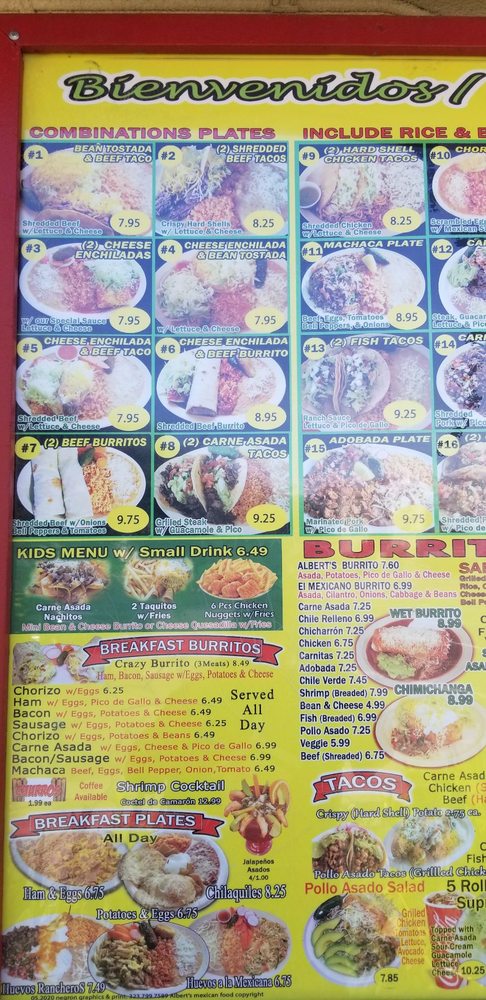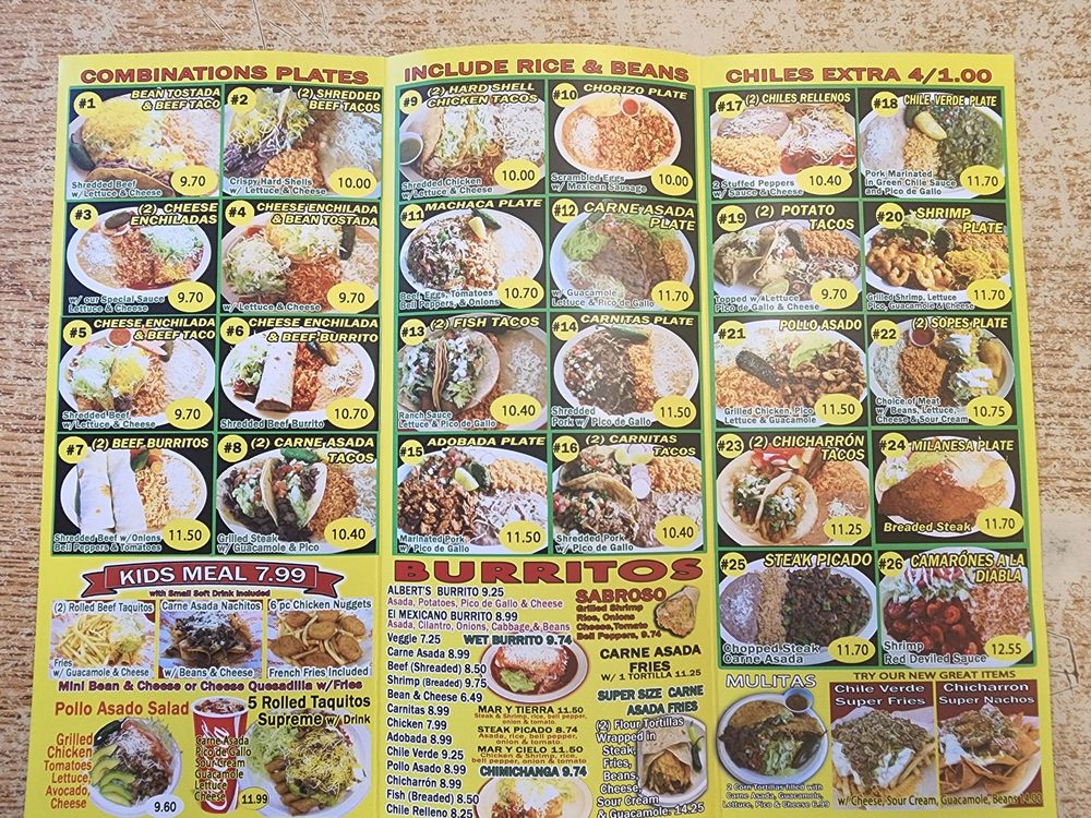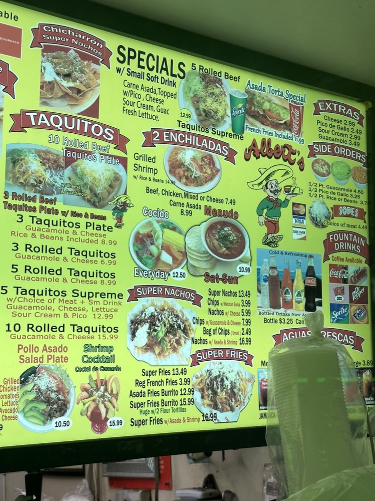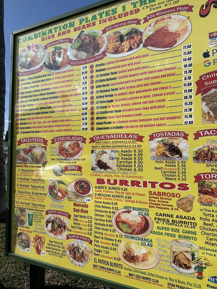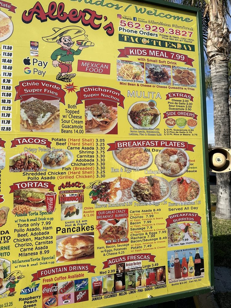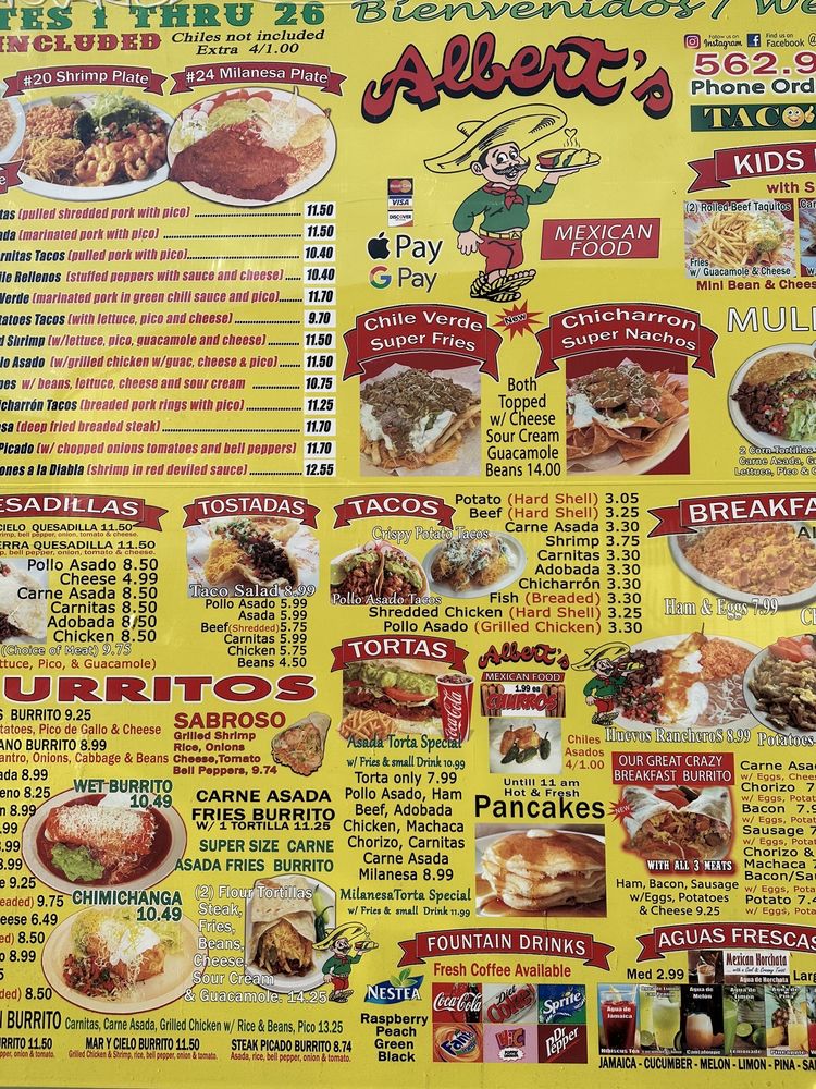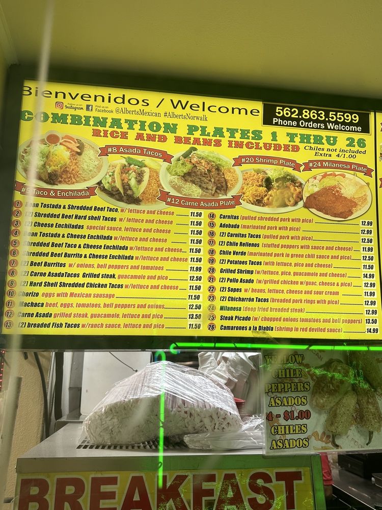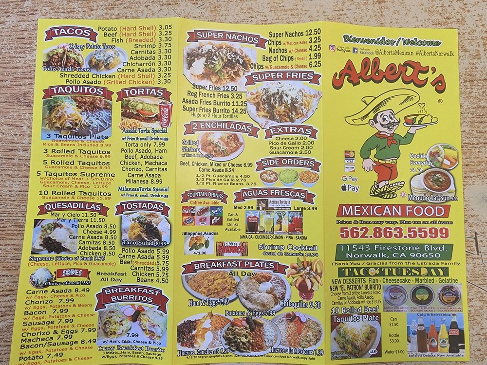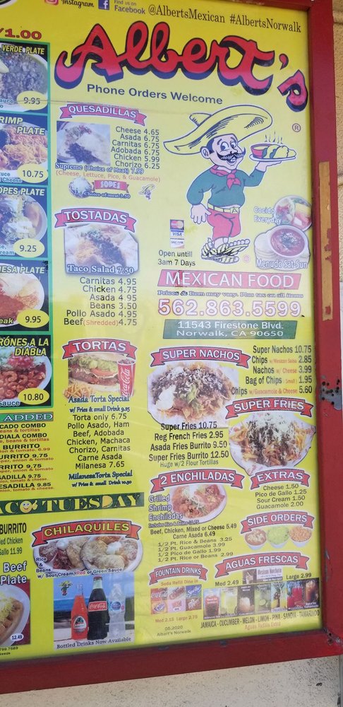 Albert's Mexican Food, located in Norwalk, CA, offers a wide range of Mexican dishes including breakfast plates, breakfast burritos, beverages, and more. Customers rave about their Al Pastor Super Fries and Asada Hard Shell Tacos. The portions are generous, and the flavors are top-notch. The restaurant has a clean and friendly atmosphere with excellent customer service. The menu features a variety of options for both meat lovers and vegetarians. If you're looking for delicious Mexican food with a great value, Albert's is the spot to visit. From their crunchy potato tacos to their flavorful caldo de res, every dish is made with care and attention to detail. Don't miss out on their salsa bar and happy hour specials.Albert's Mexican Food is a must-visit for anyone craving authentic Mexican cuisine.
